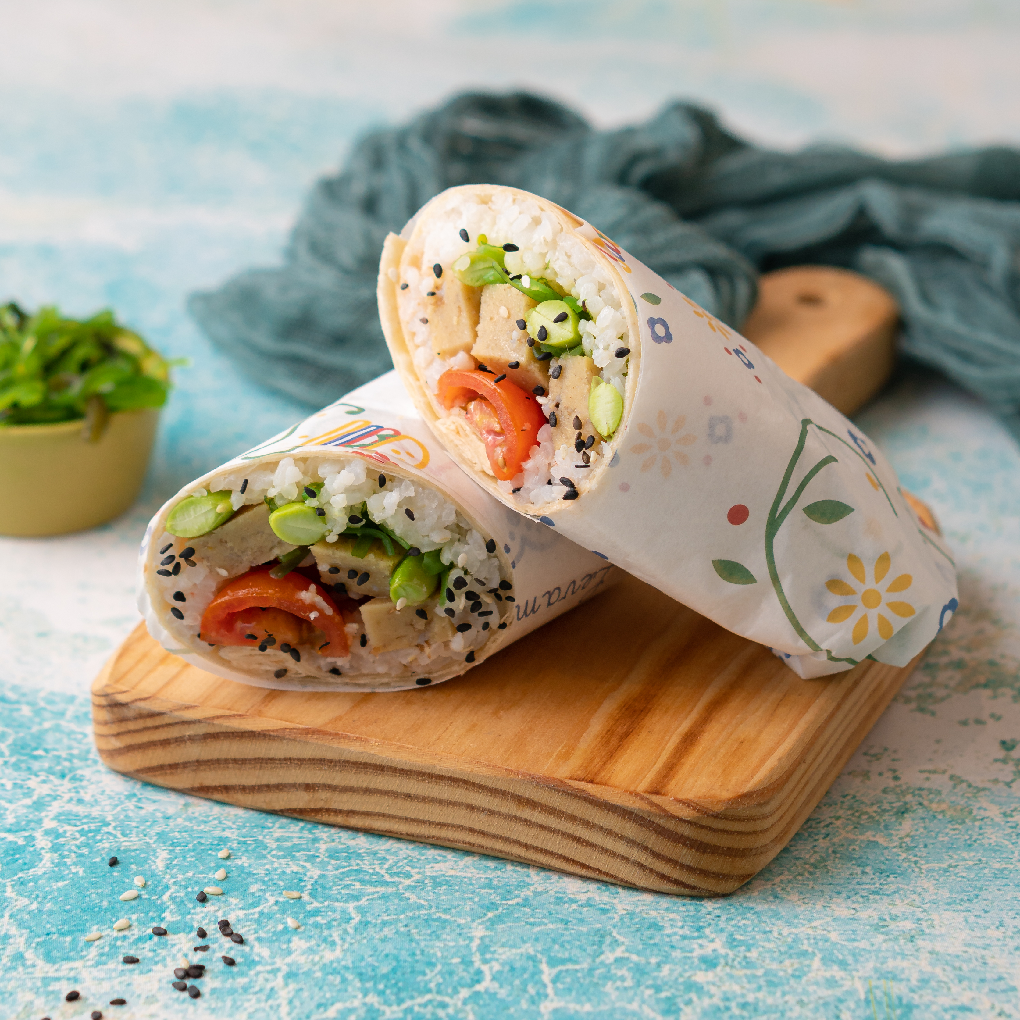 Acompanhado com seitan marinado, tomate cherry, rabanete, sunomono (salada de pepino japonesa), edamame, alga wakame e sementes de sésamo