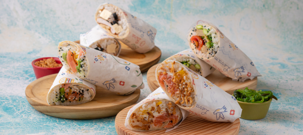 Acompanhado com salmão cru ou marinado, sunomono (salada de pepino japonesa), manga, abacate, alga wakame, gengibre rosa shun e coentros